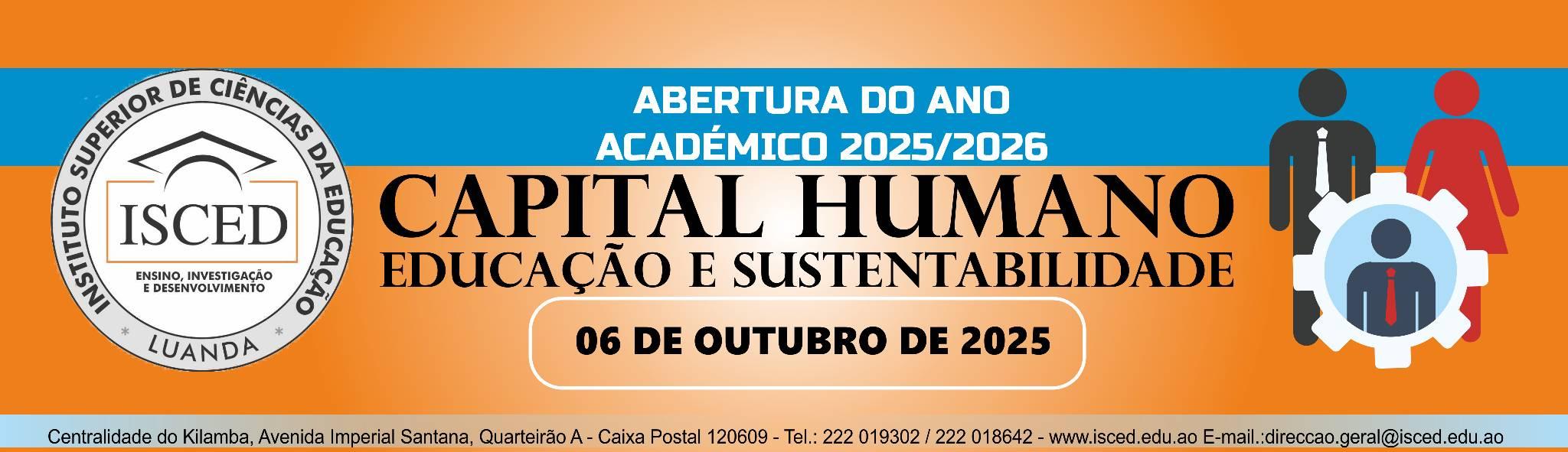 O Instituto Superior de Ciências da Educação de Luanda (ISCED-LUANDA) anuncia com grande satisfação a Cerimónia de Abertura do Ano Académico 2025/2026, que terá lugar no dia 06 de Outubro de 2025, sob o lema “Capital Humano, Educação e Sustentabilidade”. O evento marca o início de mais um ciclo de formação, investigação e desenvolvimento, reafirmando o compromisso da instituição com a construção de uma educação de qualidade, promotora de conhecimento e transformadora da sociedade angolana.