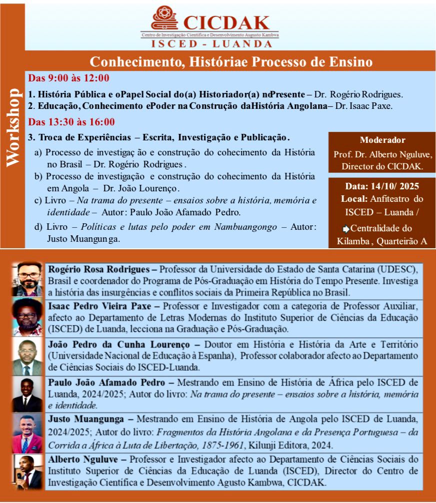 O Instituto Superior de Ciências da Educação de Luanda (ISCED-Luanda) realiza no próximo dia 14 de Outubro de 2025, no seu anfiteatro, o Workshop “Conhecimento, História e Processo de Ensino”, uma iniciativa do Centro de Investigação Científica e Desenvolvimento Augusto Kambwa (CICDAK). O evento, que decorrerá em dois períodos, das 9h00 às 12h00 e das 13h00 às 16h00, reunirá académicos angolanos e brasileiros para debater o papel do historiador, a construção do conhecimento histórico e o poder da educação na formação das identidades.